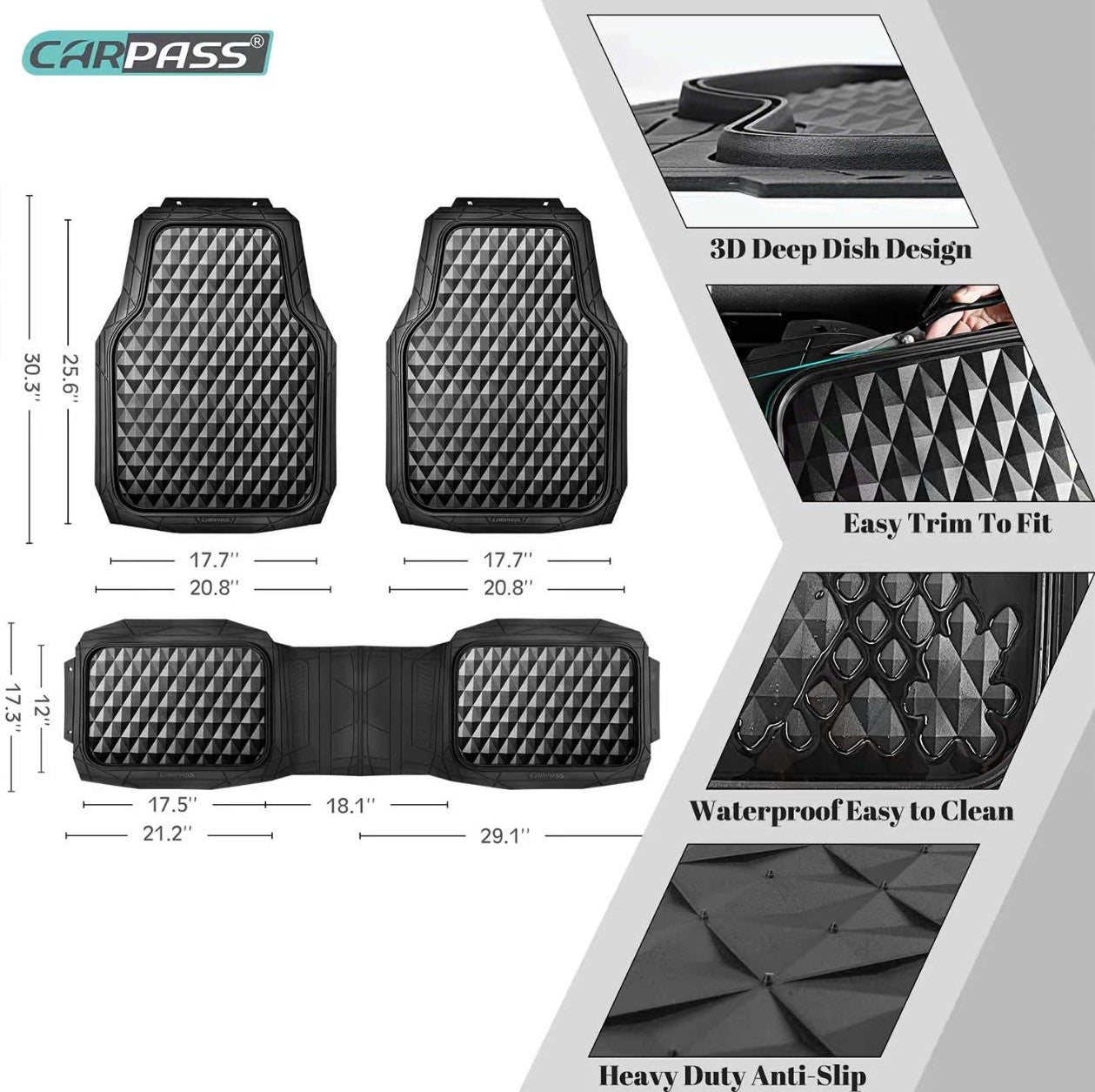 Deep channels effectively trap water, mud, sand, and spills, preventing them from leaking onto your original carpet.